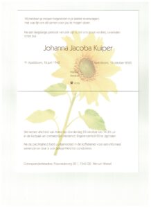 Het afscheid is op donderdag 23 oktober om 14.30 uur bij Heidehof, met daarna gelegenheid tot condoleren.